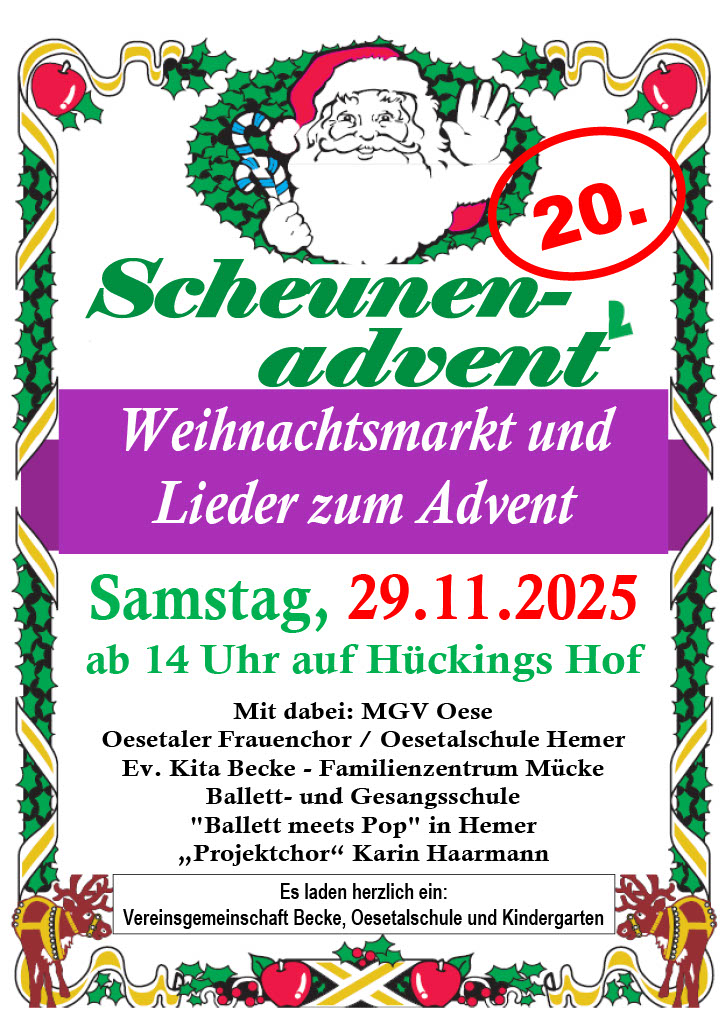 Am Samstag den 29.11.2025 findet zum 20. mal der Scheunenadvent der Vereinsgemeinschaft Becke auf Hückings Hof in Hemer statt.